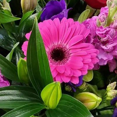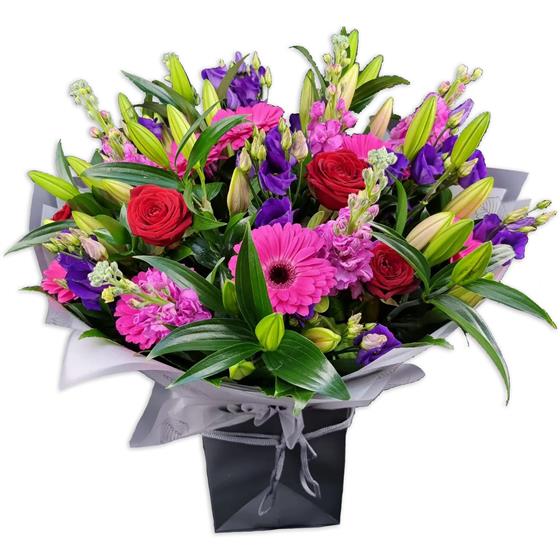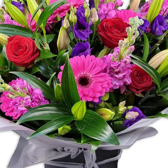 A bold, high-impact flower bouquet combining rich reds, vibrant pinks and deep purples. Designed with roses, gerberas, lisianthus and lilies, layered with glossy foliage for a full, confident and eye-catching finish.