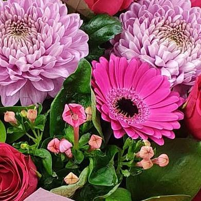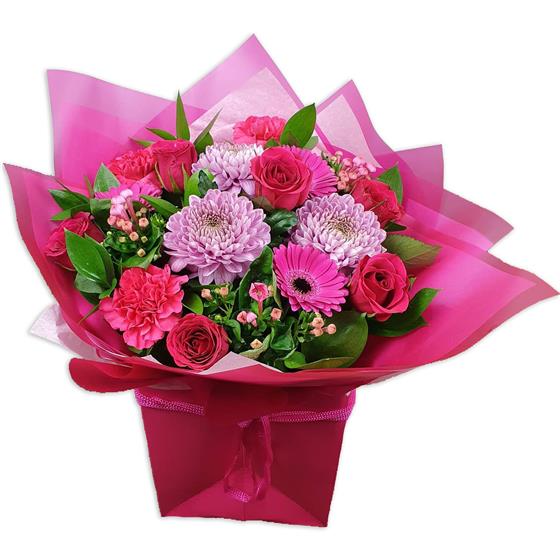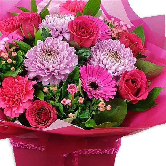 Design includes pink roses, soft pink chrysanthemums, bright pink gerbera, ruffled pink carnations, delicate berry stems and fresh green foliage, arranged into a bold, uplifting bouquet filled with texture, depth and vibrant colour.