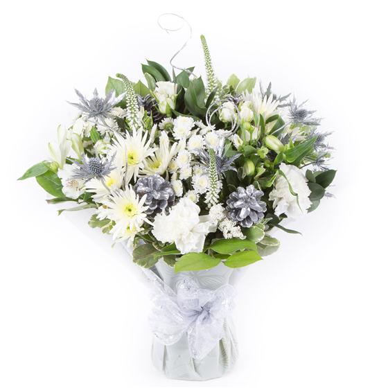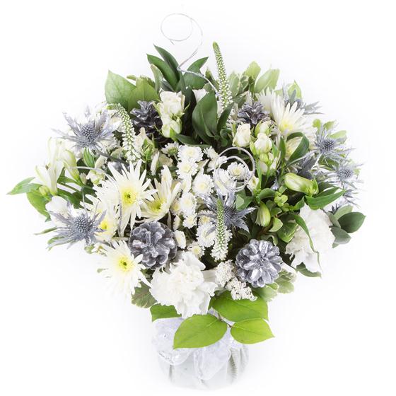 A stylish bouquet of white and cream blooms intermingled with silver eryngium and eucalyptus.