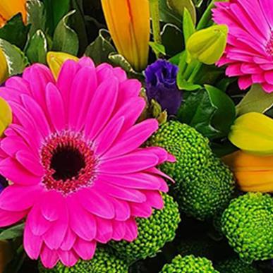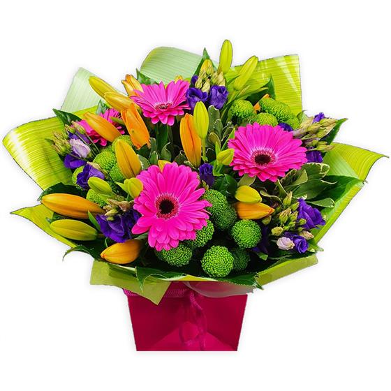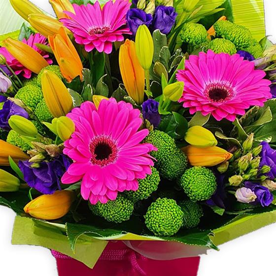 Cheerful gerberas, lilies, lisianthus and button chrysanthemums in bold pink, orange, purple and green hues, wrapped in bright paper for a tender burst of joy.